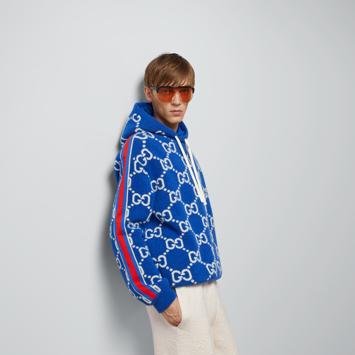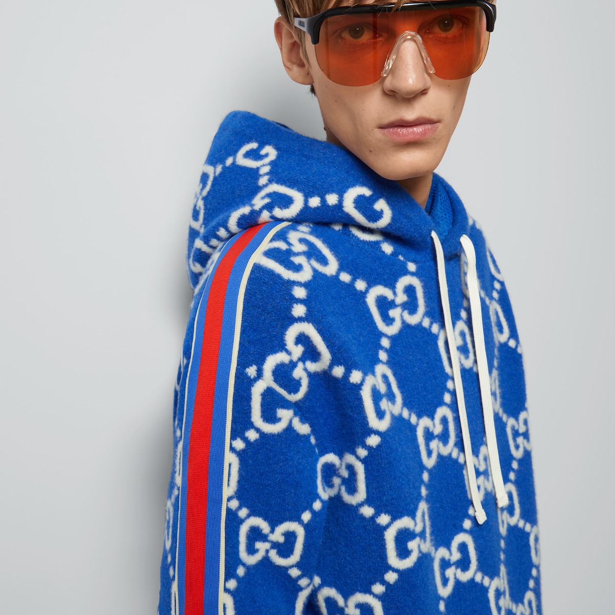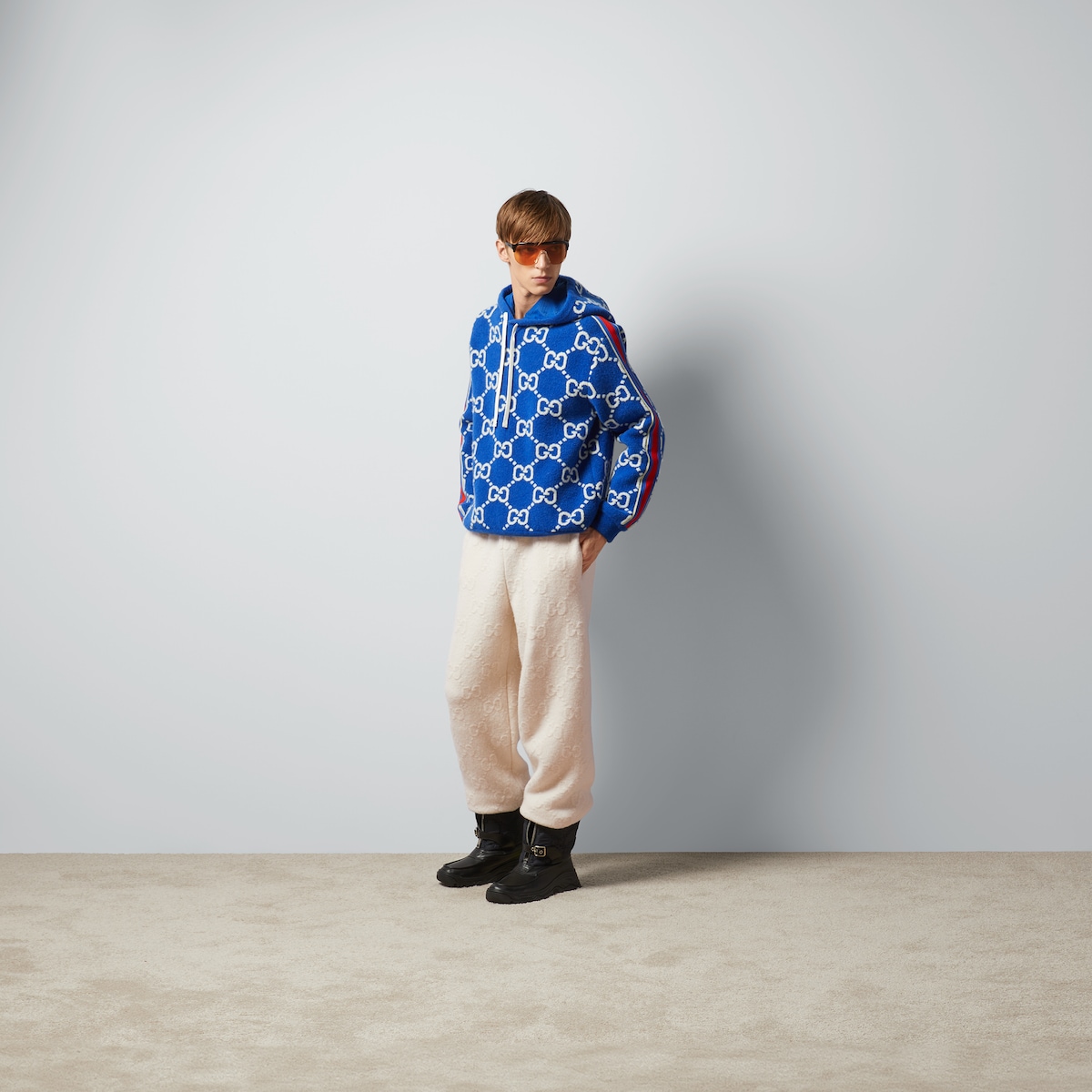 Looks from the Cruise 2024 Aprés Ski selection combine functionality with a stylish touch. Padded leather, fleece, and other fabrics are updated with new logo details. Presented in a GG wool jacquard, this relaxed hooded sweatshirt celebrates the House’s signature monogram.