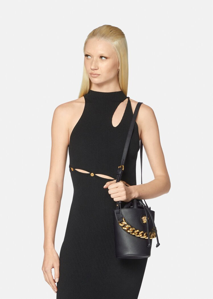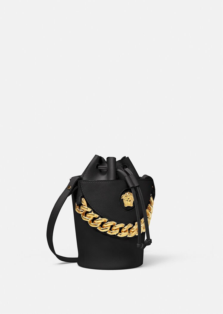 Crafted in Italy from premium leather, this stylish bucket bag is adorned with a chain-embellished Medusa plaque. The interior has a card pocket. A detachable and adjustable shoulder strap allows this style to be worn across the body.