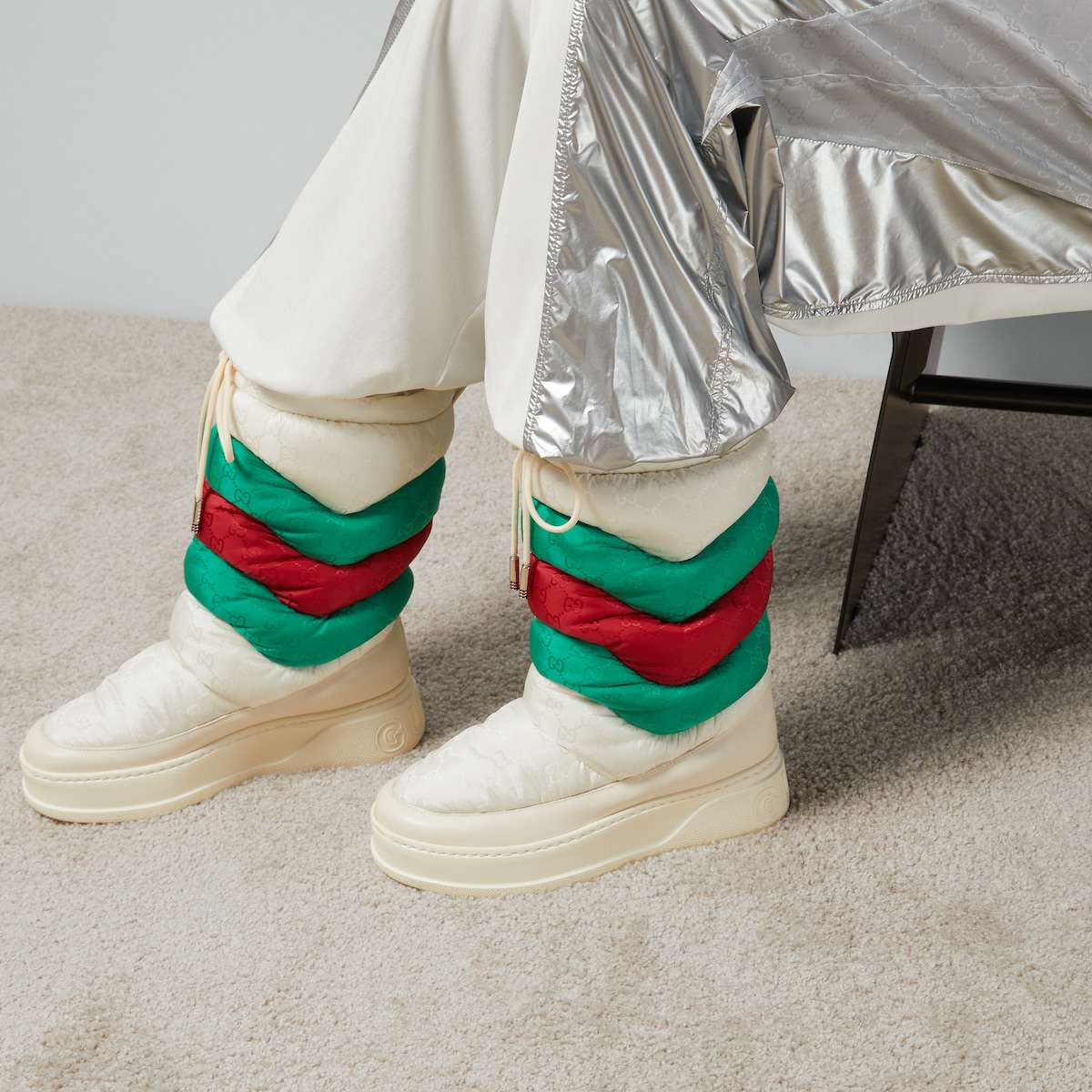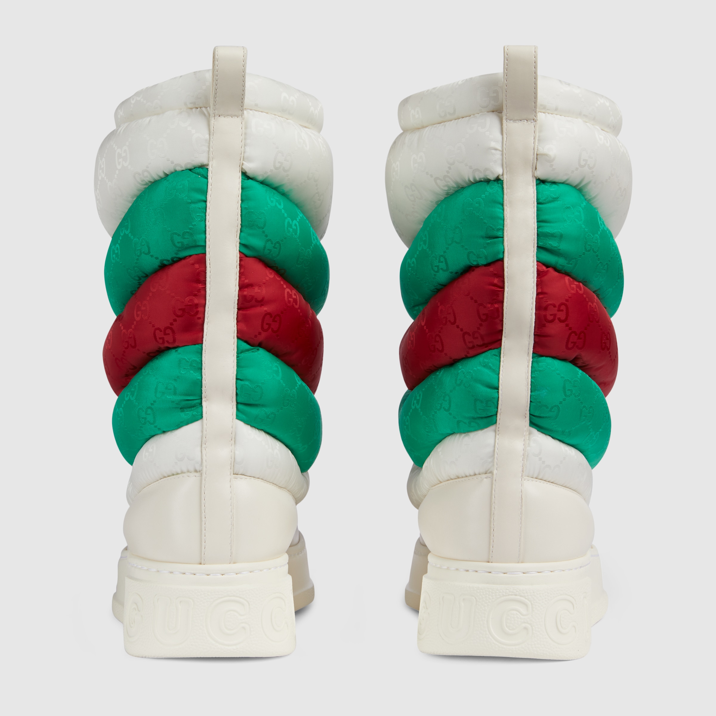 Nylon adds a contemporary edge to styles throughout the latest collections. The unexpected fabric is reimagined through the Gucci lens to create hybrid designs that mix influences. Presented in off white, this pair of ankle boots is crafted from padded GG nylon jacquard.